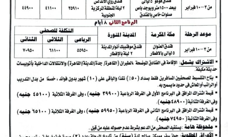 تعلن لجنة الحج والعمرة بنقابة الصحفيين عن بدء تحصيل رسوم العمرة المقرر سفرها خلال شهر فبراير القادم، وذلك اعتبارا من الاثنين (12/1/2026) إلى الخميس(15/1/2026):